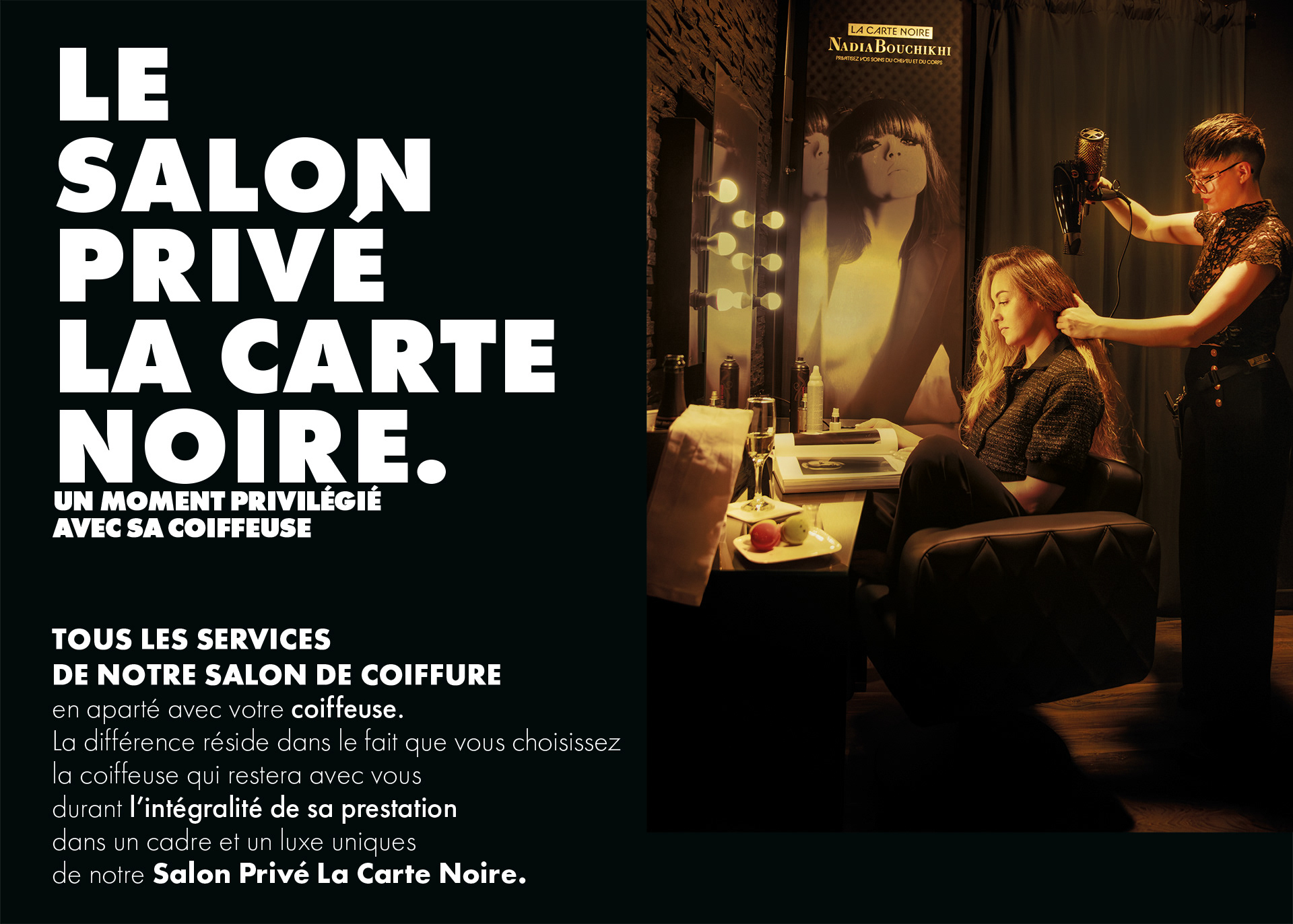 privatisez vos soins du cheveu et du corps, vivez la magie d’un moment intemporel dans un luxe unique. tout le savoir faire de renom de nadia bouchikhi, une immersion multi-sensorielle eclairage coloré selon vos préférences diffusion de fragrance adaptée aux soins plafond ecran laser de 4 mêtres diffusion de concert selon vos goûts son immersif compatible Dolby Atmos et DTS:X cocktail de fruits pressés du jour soft bar à champagne plateau dégustation selon l’heure de vos soins, diagnostic personnalisé spa du cheveu soins signature spa des mains hydromassage par hydrojet salon de coiffure privé.